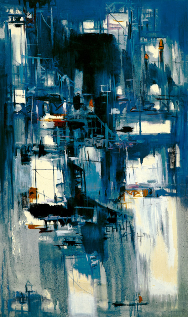 而從創作於1974年這件精彩拍品《鐵橋河畔》看來,白拉達的預言果然成真。在這件融合鐵橋與河畔雙主題的作品中,蔡雲程彷彿是要將西方的油畫給「中國水墨化」。他把藍色當做中國的黑墨,讓油畫顏料在畫布上自然渲染和流淌,同時利用「留白」所產生的明暗對比,營造畫面的空間感;而短筆觸的使用,亦加強了畫面的「動能」,使得整幅畫作洋溢著一種難以言喻的夢幻與迷離之美。