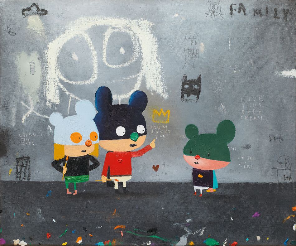 Having grown up in Southern Europe, Plans' paintings deliver a natural sense of warmth through themes based on his life experiences and issues he cares about. He has an admiration for street art including graffiti, comics, illustrations, as well as animation movies. His artworks have been critically influenced by the urban contemporary character styles in these works. He also learns by observing the styles of masters like Jean-Michel Basquiat, Keith Haring, Takashi Murakami, and mixing in a blend of his own unique characteristics. Plans like to apply white or colored outlines to urban landscapes and country views on a gray background to form a chalk-like scribbly texture. Around 2009, Plans created "Animal Hero", a character with Mickey Mouse-like ears and big eyes in a helmet and cape. The stylish elements from comics and movies have made this figure one of the artist's most iconic signatures. By telling interesting little stories as a superhero or in the disguise of a pilot, veterinarian, architect, soccer player, chef, cyclist, or painter, this character makes an appeal about politics and current events.