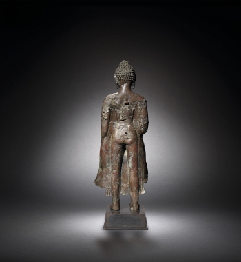 Standing with both legs straight, the broad shoulders swathed in a flowing shawl finely incised with a foliate motif along the rims and opening to reveal the bare chest, the right hand raised in abhaya mudra, the face modeled with a gentle smile, elongated eyes, and gently arching brows flanked by a pair of circular earrings, the hair arranged in regular rows of tight snail curls whorls surmounted by a domed usnisa.