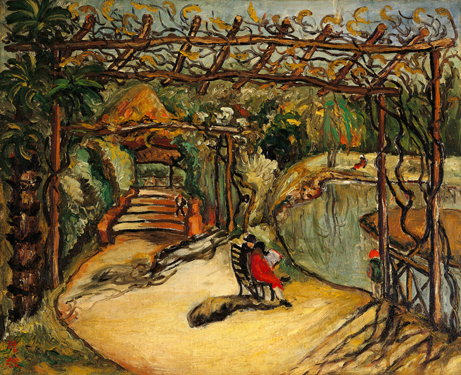 1933年所作《法國公園》,融合中西藝術,此件風景畫風格將線條大量運用於畫面上,作品中的倒影與草叢藤蔓的色調飽和度一致 ,各部份的處理相當和諧 ,有類似毛筆勾勒與撒的技法存在,不僅樹枝可以線條表現,甚至階梯、人物、光、影也均以線條表現,此作應可被視為該時期的成熟作品之一。