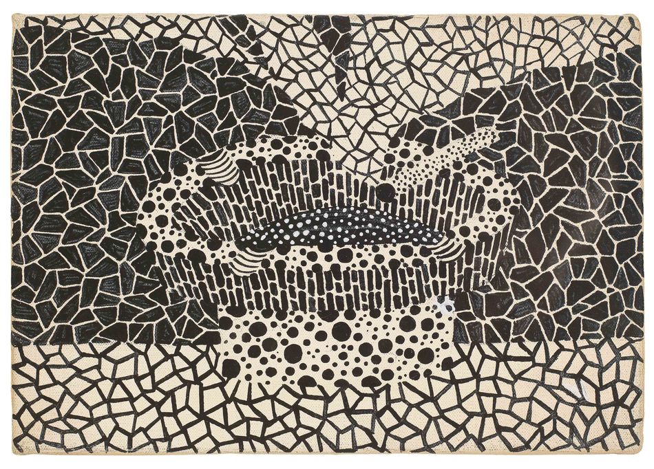 草間彌生把藝術視為對自己精神疾病的表達,在她所有的藝術中,波點和無線網是最具有代表性的。《菸灰缸》這張精彩的作品中以黑、白、灰三色呈現了草間彌生最具標誌性的兩種藝術元素。在1980年代的作品中,草間創作了大量的三色和原色作品。這一時期畫面的主題本身大多是具體的實物,如南瓜、高跟鞋、到蛋糕、洋裝、富士山、菸灰缸等。菸灰缸主體由黑色經典波點圖案組成,小面積幾何圖形堆疊構成菸灰缸的底和沿。顆粒感倍出,又大小不一,錯落排列的波點,形成如同浮雕一樣的高低起伏的視覺動感。這種單調會讓觀眾感到茫然,進而慢慢被一種暗示與沉靜的氣氛感染,進入「無限」的暈眩中。背景的網紋與桌面紋路成反色,使作品平面化的表達中,也能體會出立體的遠近凹凸和觀賞情緒的變化,時而緊張,時而舒緩。