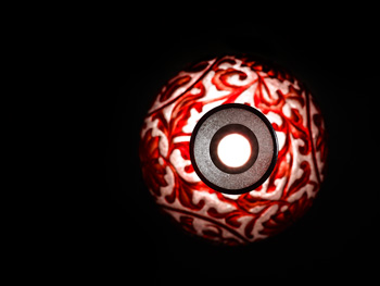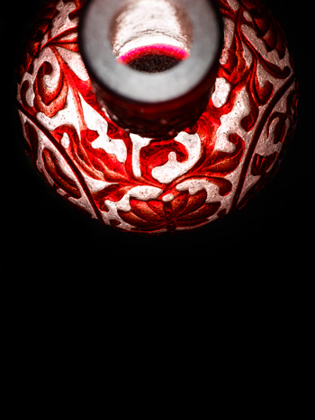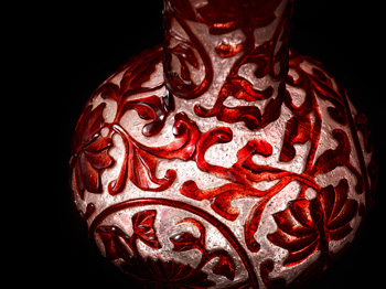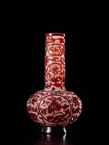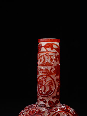 瓶為吹製而成,直口,細長頸,球形腹,圈足。通體半透明珍珠地套紅色 玻璃,頸壁前後各兩組扇形和圓形開光,開光內浮雕折枝花卉,開光外飾 纏枝番蓮紋。腹壁前後各有一個圓形開光,開光內填折枝花卉,開光外滿 飾浮雕纏枝番蓮紋。正面口沿下鐫橫書「大清乾隆年製」六字款。 是件玻璃直頸瓶,做工繁複,花卉線條翻捲自然,裝飾造詣成熟,紅白兩 色搭配巧妙,視覺效果極佳,信為清宮珍藏的宮廷珍玩。