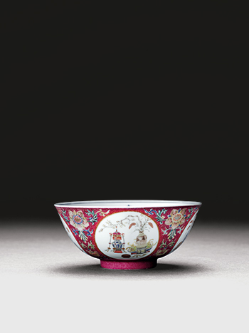 清道光 粉彩胭脂紅地軋道開光博古紋碗