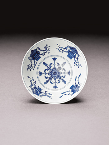 碗撇口,弧壁,深腹,腹下漸收。內壁繪釉下青花,碗心兩道平行圈紋,圈 紋內繪「米」字形團花,團花由稻穗、蓮花、彩蝶等組成,綰合腹壁的四組 燈籠紋,遂有「五穀豐登」的吉祥寓意。外壁做四組圓形開光,開光內繪粉 彩博古紋,開光外滿施軋道胭脂紅為地,錦地上繪纏枝寶相花。圈足內書青 花「大清道光年製」三行六字篆書款。
