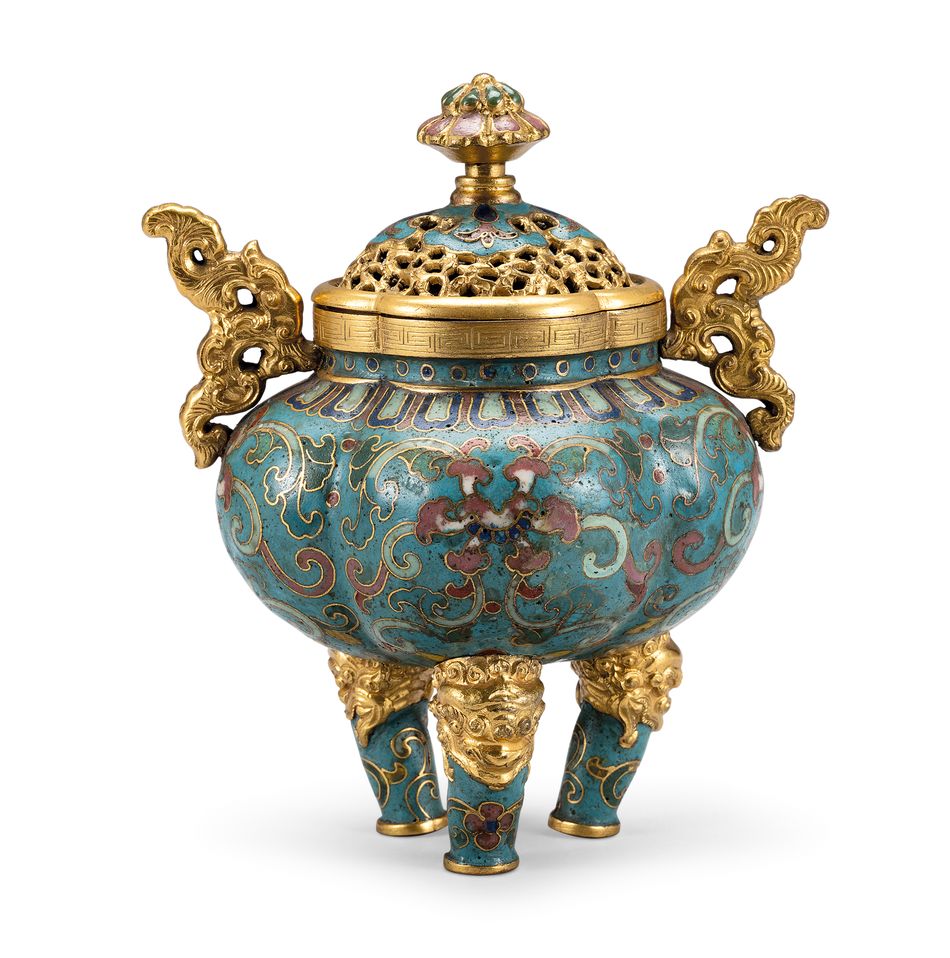 A Gilt Bronze Cloisonné Enamel 'Lotus' Tripod Censer and Cover