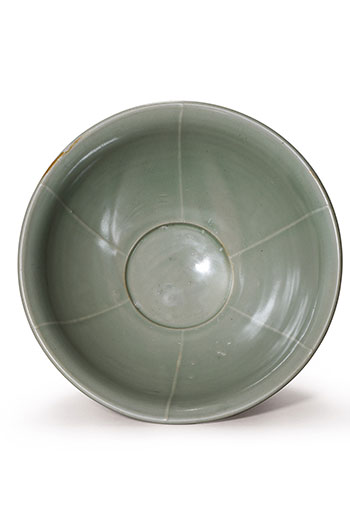 盌撇口,為目前已發現的耀州窯此器型最大的一例。通體施青釉,釉色清澈,盌口內出筋六道,優美勻稱。斜鼓腹,小圈足,圈足修葺工整,器形端正,樸實大方。尤為展現出北方耀州窯瓷器的簡約。MD: 25 cm