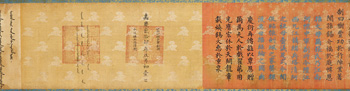 誥命以五色織錦為地,卷前經緯起雙龍「奉天誥命」篆字,後以五色滿漢文書寫誥授江南河標中軍副將今陞江西九江鎮總兵之事,末署嘉慶貳拾肆年正月初壹日,並鈐「制誥之寶」漢滿文璽。誥命又稱誥書,是皇帝封贈官員的專用文書。清封贈一品至五品官員授以誥命,其提名、撰擬、繕寫、核對至頒發皆有嚴格規定。本件已經重新托裱。