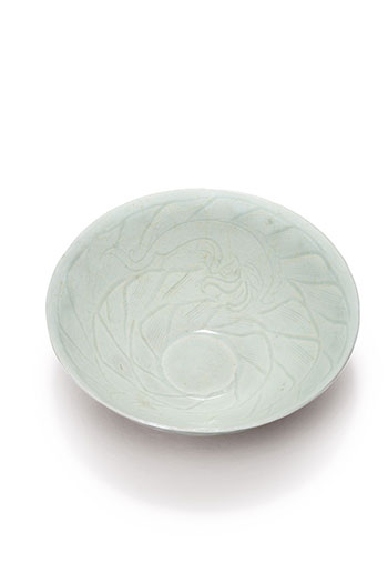 This teabowl has a gently arched belly and a round foot. It is completely covered with bluish-white glaze, and both its inside and outside are decorated with an ocean wave design, with more finely chiseled water ripples incised within the deeper grooves of the swell. The carving is meticulous and detailed, and there are two sea dragons engraved on the inside, mythical creatures with a dragon's body and a fish's tail. This auspicious design symbolizes the prosperity and refined lifestyles of the Song dynasty.
