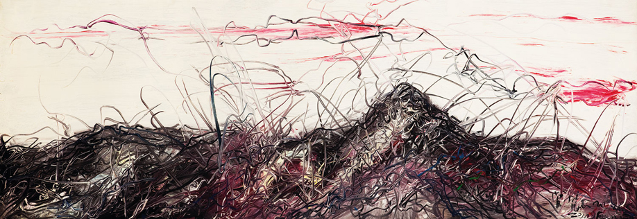 Zeng's masterful brush strokes add to the heightened sense of power and emotion. They are indicative of his free flowing and subconscious painting style, allowing his moods and emotions to flow onto the canvas. Zeng uses two brushes held in one hand between different fingers to create his chaotic, wild strokes. Just as with a pair of chopsticks, one brush is held firmly with three fingers while the second one moves freely between two fingers. The first one creates deliberate thought out strokes, the second follows, freely creating whatever lines it wants. The first stroke is like our conscious, controlled thoughts, the second stroke like our wild, uncontrolled emotions allowing Zeng to create an abstract landscape of our inner psychological state. This psychological state is further represented by the peaceful and calm sky juxtaposed with the dark, mysterious hill covered in wild vigorous grasses. Calmness and turmoil are wonderfully rendered.