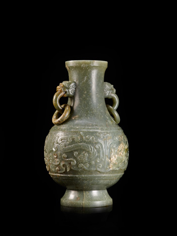 類似器: 北京故宮博物院藏有一件清乾隆〈和闐青玉獸耳活環 壺〉,觀其整體風格與本拍品極其雷同,詳見:李久芳主 編,《中國玉器全集‧6‧清》,台北:錦繡出版事業, 1994年,頁125。