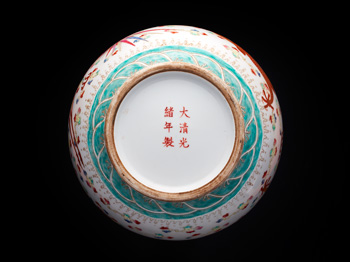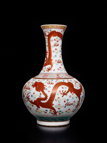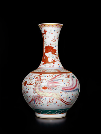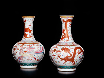 賞瓶一對,撇口,束頸,溜肩,肩部兩道凸弦紋,球形腹,腹下漸收,圈足。通體罩透明白釉,釉上施粉彩裝飾。口緣下一圈黃地粉紅釉彩如意雲肩紋,頸部繪工筆紅彩描金行龍趕珠,龍紋外圍繞繽紛的五彩祥雲。肩部兩道凸弦紋滿施金彩,兩弦紋內繪纏枝寶相花,寶相花上嵌壽字。腹壁飾多彩描金龍鳳紋,龍鳳作行逐趕珠貌,腹部近底足處飾海濤紋。底書紅彩「大清光緒年製」雙行六字楷書款。