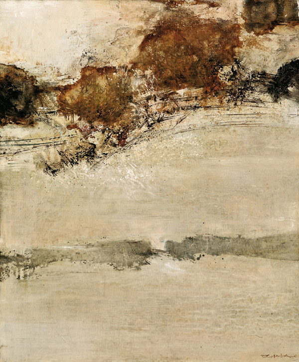 赵无极的油画作品《11.10.78》完成于1978年,就其行云流水的和谐画风来看,画家似乎仍沉浸在新婚的愉悦之中。一年之前,赵无极与结识四年的年轻博物馆馆员梵思娃结为连理,两人理解彼此的工作,而成为灵魂的伴侣,何其幸福的归宿。赵无极的作品《11.10.78》显示出温柔、沉稳、优雅的新文人风格,追求空间与光线的细致表现。画面前景平涂颜色,偶见泼彩,濛濛云雾,扑朔迷离,意境缥缈。浅褐色幽幽抹过,空间形成上下的分野,其间干擦出少许淡淡的飞白,大地万物仿佛隐入烟云缭绕中,诗意的想像无限辽阔。
