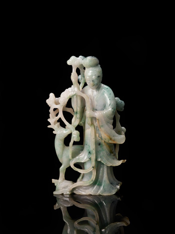 整料緬甸翠玉雕成,通體構圖採左虛右實,前實後虛思維揮灑,亦即右側與正面為實,左側與後面為虛,實的部分雕麻姑,麻姑頭綰高髻,面容祥和,身著交領長袍,右臂在上,左臂在下,手握靈芝。麻姑一側鏤雕行鹿,鹿銜靈芝,靈芝草以透雕的技法表現,增添翠玉擺件的靈動氣息。
