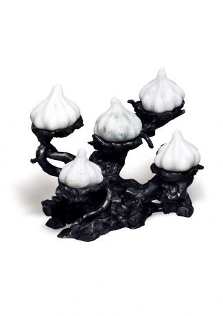 Comprising five well carved jadeite garlics each with occasional green specks and pale lavender patches, representing the rebus "Shen Ji Miao Suan" or "with wonderful foresight", to a carved wooden tree trunk, biggest jadeite garlic approximately 76.0 x 72.0 x 60.3 mm, garlic with wooden stand approximately 21.0 x 27.0 x 17.0 cm