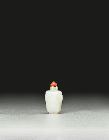 和闐玉雕成,玉質甚佳。圓口,直頸,折肩,長方腹,四面腹壁邊緣起倭角線,腹下漸收,平底,下承四方倭角圈足。通體光素,惟腹壁兩側近肩部處浮雕獸首銜環為雙貼耳。全器線條優美,簡潔中可見精細的雕工,是一件藝術性很高的頂級鼻煙壺。