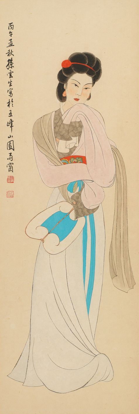 此作於1966年新店五峰園所繪,孫雲生在1954年曾繪一仕女圖,當時所繪仕女的神采便是取自髮妻時菁所描摹,心神所略,然而當時孫雲生的仕女風格,停留在宋、元、明的仕女人物畫時代,在巴西八德園期間,大千要其臨摹唐代仕女,並將其粉本交至雲生細細摹會,到了1966年,此畫作中的仕女,可看出其線條以唐風鐵線描繪,面孔的處理採以淡墨勾繪五官臉型,濃墨表現髮髻,畫中足見細勁勻稱的筆力,線條極其流暢,勾繪出女子婀娜姿態,畫中女子執一扇似沉思,水袖領口精細描繪,賦色清麗,粉袖襯其面容的奼紅,凸顯仕女雍容華貴,別具莊重典雅之氣度。