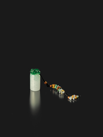 緬甸玉雕成,老坑玻璃種質地。翠地與白地的顏色分明,印鈕能充分利用整料玉材的精華所在浮雕三腳蟾蜍為高鈕,印身不施任何紋樣,純然表現緬甸玉的另一種呈色美。 是件圓印顏色對比強烈,尤其是蟾蜍鈕的質地嬌豔欲滴,不僅視覺上已贏得眾人的青睞,同時三角蟾蜍更有招財的吉祥寓意,誠是一件精巧絕美的頂級翠玉珍品。