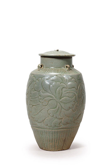 A VERY RARE YUEYAO CELADON CARVED JAR WITH COVER Northern Song Dynasty (AD960-1127)