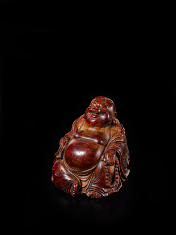 布袋和尚竹根雕成,髡髮寬顙,濃眉大耳,張口露齒,仰頭歡笑。臉型肥碩,袍衣垂落肩臂,袒前胸,露肥肚,兩臂自然下垂,右手持握巾袋,左手捻珠串,倚袋舒坐,一派大肚能容的福樂神態。是件竹根雕器型碩大,所刻人物圓潤細緻,姿態摹刻淋漓盡致,係屬名家之手的清雅佳器。封始岐,清代嘉定(今屬上海)人,字時周。《竹人錄》載,謂其性恬澹,家貧無以自給,藉技能以資衣食,所製亦工妙。