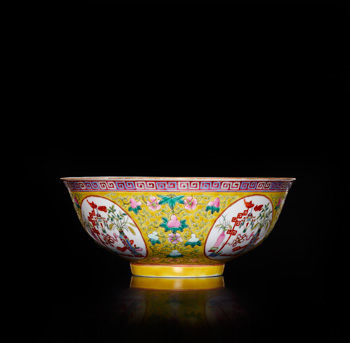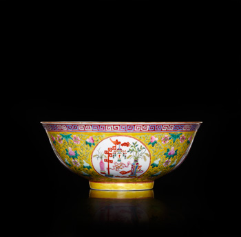 類似器:南京博物院藏有一件清光緒〈黃地粉彩纏枝葫蘆開光博古紋碗〉風格與本件拍品雷同,詳見:徐湖平主編,《中國清代官窯》,上海:上海文化出版社,2003年,頁469。