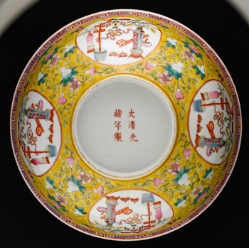 清光緒 黃地粉彩纏枝葫蘆開光博古紋碗
