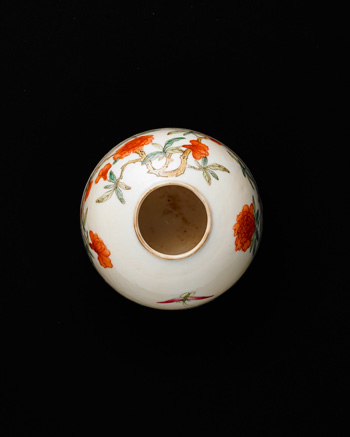 斂口,豐肩,馬蹄腹,淺圈足。腹壁滿飾暗花,透明釉上繪粉彩折枝花卉,花葉扶疏,朵花綻放,一旁有彩蝶翩翩飛舞,予人清雅麗質的書卷氣息。