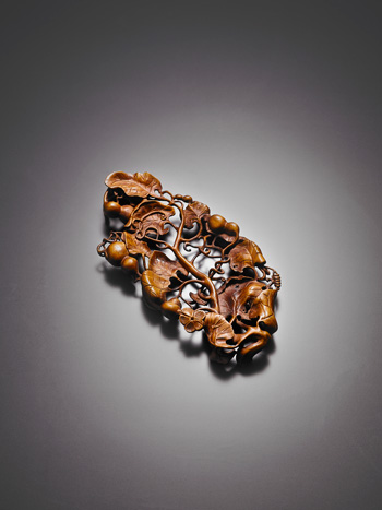 水洗白玉雕成,玉質瑩潤潔白。水洗的主體作一牡丹花蕾造形,花蕾內膛掏空成膽,中可儲水為洗。花瓣形圓口,扁腹,平底,腹外壁以剔地浮雕技法,琢飾相互交疊的花瓣紋。底部以斜刀勾勒出花瓣輪廓,連結蒂部的枝梗自一側斜出,蜿蜒至一端後,又反轉繞過花瓣底部,最終收於另一端且呈葉脈盤繞狀。下承鏤空蔓藤葫蘆四季花卉紋黃揚木底座,其中蔓藤的纏枝蔓帶可諧音萬代,而葫蘆因為是多子的果實,合而觀之,自有「子孫萬代」的隱喻。牡丹,花朵碩大,姿容端莊,自古以來即有:「萬花一品」的稱號,又牡丹天香夜染,雍容華貴,因此也有「富貴花」的美譽,宋人周敦頤《愛蓮說》嘗謂:「牡丹,花之富貴者也。」事實上,牡丹不僅成為歷代文人品詠的最佳對象,同時萬花一品的尊貴形象,也讓牡丹具有富貴的表徵。由此看來,水洗作纏枝牡丹,應該也隱含了富貴萬代的吉祥寓意。
