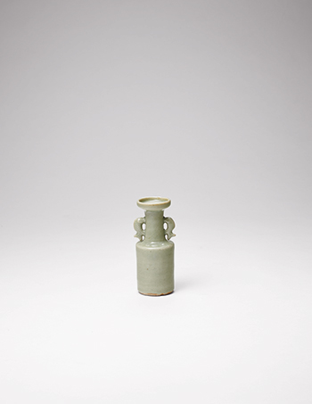 盤口,長頸,折肩,直筒身,圈足。頸部兩側安一對頭上尾下的魚形耳,通體施梅子青釉,釉面開細片紋。圈足底牆不掛釉,露出灰色胎土,圈足與底部掛釉交接處有火石紅痕跡。是類雙耳瓶多見於宋代,雙耳的造型也別具多種樣式,既可做為盛水插花的齋格陳設,同時亦是案頭清供的把玩珍品。