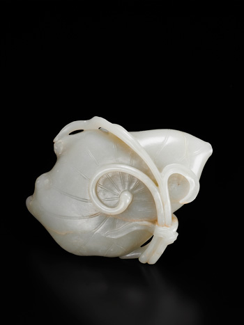 Exquisitely worked to the form of a folded lotus leaf, the exterior with additional conglomeration of lotus blossoms and leafy tendrils issuing from a curved undercut stems forming a root. The lotus is indigenous to ancient China and the present lot skillfully render the flower and its various component, including its petals and stems, unopened, Zhou Dunyi (1017-1073 CE), the writer of a well-known essay about lotus, referred to the elegant plant as ‘the flower of purity and integrity’ since it emerges from mud but the beautiful form of the lotus remain unstained while it grows. Compare with a very similar vessel worked in the form of an elegant lotus leaf from the Palace Museum in Beijing, illustrated in The complete collection of treasures of the Palace Museum, Jadeware II, Shanghai, 2008, no.187, p.226.