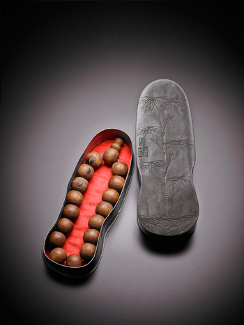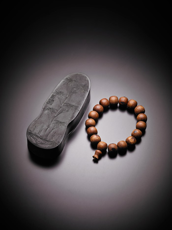 十八子手串沉香木刨成,串珠顆粒碩實,油結飽滿,香氣清淡。所盛錫盒作古琴貌,天地子母口套盒,蓋面鐫勁挺的叢竹紋,一旁署「戴」、「春林」上下三字方框楷書款。戴春林是創立自明崇禎年間的老字號香舖,位於繁華的揚州,據聞戴春林家的香粉因含有天然的珍珠粉,因此當時即以名貴著稱。清康熙皇帝南巡揚州之際,太監們對戴春林的香粉十分青睞,特地將一批香粉「貢品」帶回宮中。於是,揚州戴春林的聲名鵲起,所製香粉也從此名動公卿。