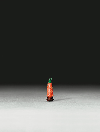 A coral carving in the form of an elongated melon. The surface is decorated with winding vines and leaves carved using bas-relief techniques. A lid in the shape of a green flower stem complements the body of the bottle perfectly. The carvings across the item give off a lively energy, bringing auspicious tidings of growth and prosperity.