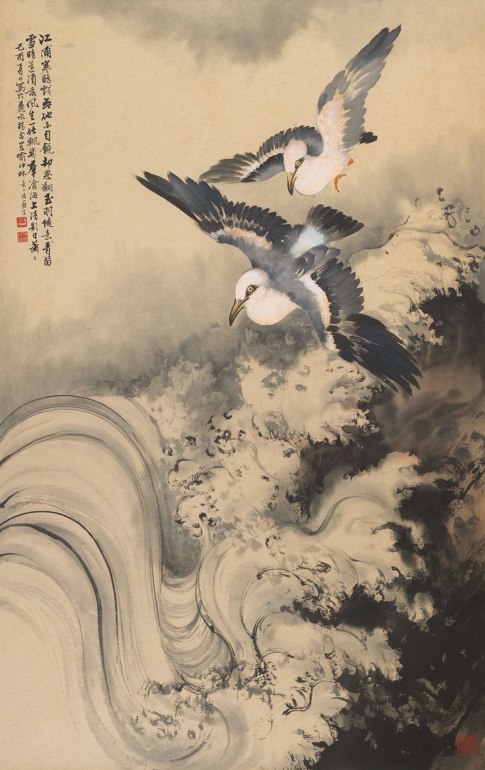 《江浦寒鷗》此作曾參展1971年中華民國第六屆全國美術展國畫展會,為喻仲林少見以禽鳥與海浪結合的構圖。喻仲林慣以左手作畫,但此圖卻反常態,以海鷗自右方往左下做俯衝勢,可知其佈局求新求變的嘗試,喻氏以俯視法角度將描繪之物投入畫面;畫中海鷗背部、振翅、尾羽均以墨色分染,再以花青、赭色平染出層次,後敷白粉將胸腹、羽尖與翼鏡作出鮮明呈現,頭頸處則略用撞粉作出冬季寒鷗特有褐色細紋。前方鷗行展翅、後方斜飛緊隨,一高一低的樣貌表現更讓圖面充滿栩栩如生的動態。海浪的描繪則用中鋒快筆勾出瞬息萬變的海浪擊打礁岩的場面,枯筆畫成洶湧的波濤,墨色與粉白融於一體,細線鉤勒浪花前緣,突顯出海潮澎湃、由上而下翻捲的滔天氣勢,脫離傳統工筆墨線描繪海浪的方式,以寫意筆調將暗湧奔騰的逼真場面如實呈現,盡顯寒氣逼人的畫意,增添些許詭譎的氛圍。畫中題款杜甫詠鷗詩句,帶有歸潔自身,不應追逐世間名利的寓意。
