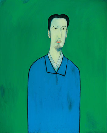 邱亞才的人物畫裡即有著中、西難辨的氣質存在,大膽有勁、強烈用色的平塗背景有著野獸派的色彩觀念,而中國傳統的白描精神,單純的線條構造勾勒出細緻的五官,不拘泥在形式、細節,卻精彩的描繪出人物的神情。此幅作品畫中人物,杏眼、柳眉、紅唇,看似氣定神閒的注視遠方,但白皙的皮膚透著對比的藍色氛圍,隱約看出些微的情感表徵。