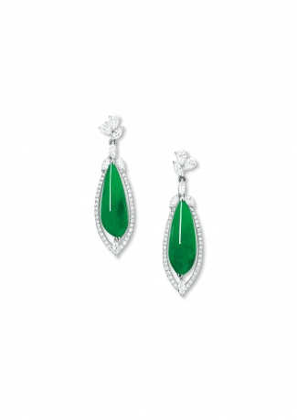 Each set with a navette-shaped jadeite cabochon of emerald green color and very good translucency, within a brilliant-cut diamond frame enhanced by marquise-cut diamonds, suspended from the pear-shaped and marquise-cut diamond top, mounted in 18k white gold, jadeite cabochons approximately 23.9 x 8.6 x 4.3 and 23.9 x 8.7 x 3.9 mm, 4.5 cm long