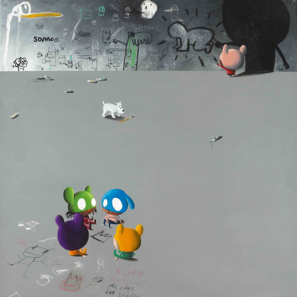 《向八零年代的塗鴉藝術家致敬》創作於2019年,在他的作品中可以見到用壓克力顏料像牆一般砌起。畫面左下方小英雄們分別代表了基斯·哈林(Keith Haring),尚米榭‧巴斯奇亞(Jean-Michel Basquiat),Al Diaz,Lee Quinones圍坐在一起,周圍是各種可愛的塗鴉元素、巴斯奇亞標誌性的王冠圖案,以及四位藝術家的名字。畫面中央散落著顏料和畫筆,一條活潑可愛的小狗嬉戲。畫面上方,呈現八零年代藝術家們的經典元素,凱斯·哈林著名的畫作符號「發光的嬰兒」,尚米榭‧巴斯奇亞和阿爾·迪亞茲(Al Diaz)合作的標誌「SAMO」,並有「Street art」 ,地鐵藝術「Subway」等符號。畫面左上方,有一盆盛開的鮮花,同樣是圓圓可愛的大眼睛,也象徵著,向這四位八零年代塗鴉藝術頂尖藝術家致敬。