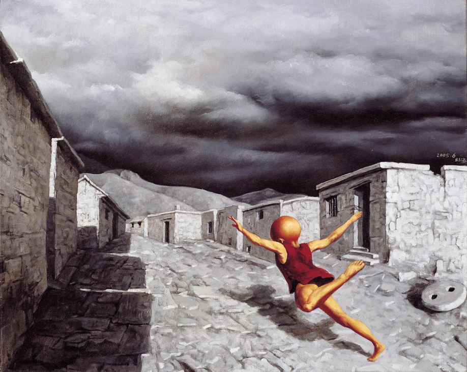 張林海的少年時期一直在河北省涉縣度過。在地理的歸屬上,位於太行山東麓的涉縣,行政上隸屬河北省,地理位置則為山西、河北、河南三省的交界處。在抗戰時期,因劉伯承和鄧小平運籌赤岸、八路軍一二九師鏖戰太行這一重大戰役而使涉縣名垂青史。但這一重大意義卻絕非藝術家的創作著力點。張林海作品中反覆、長期出現的涉縣山村層迭錯落壘起來的石頭房子和光頭的少年形象,有著某種不可分割的聯繫,這一方面和藝術家少年時期的生活經歷密不可分,另一方面藝術家通過這兩個緊密相連的畫面元素,重複的形象、帶有超現實主義的風格,構成了張林海的畫面特點,也構成了藝術家的精神意象:無論是孱弱的光頭少年,還是烏雲遍佈、壓頂而來的天空,張林海的作品裡不掩憂鬱和傷感。在中國當代藝術家的創作群落中,擁有版畫系背景的藝術家創作實力不俗。在張林海的畫面中,平整卻極具空間感的畫面同樣出自藝術家版畫的創作基礎。