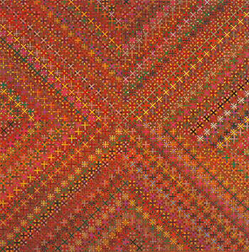 1989年開始,丁乙開始利用成品布進行創作,這使其作品更具觀念性。本幅作品,就是創作在成品布上的。此幅作品以格子成品布為基底,再進行繪畫,隨著筆觸,又使得豐盛而炙熱的色彩逐漸顯露出來,製造出畫面原始的肌理走向。多重的線條厚薄、深淺有致,張弛有度,一橫一豎「十字」間不再只是單純的符號排列,而是體現了中國書法之美,似乎在預示禪宗中所體現的辨證性。與早期同一系列的「十示」作品相比,這一時期的格子形成了一個更加豐富和復雜的藝術體系,體現了丁乙對格子語彙的掌控和調度能力。
