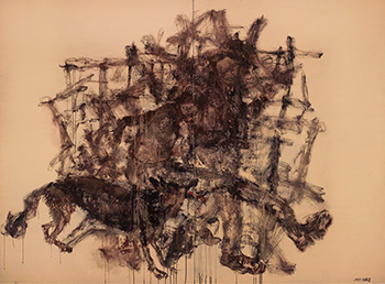 這幅作品中仍然有德國表現主義的影子,但此時他開始研究中國的文人畫,曾經畫了一批文人畫式的風景,筆觸鬆動率意,有著文人畫逸筆草草的味道,但周春芽最終結合了來自西方的表現主義和中國傳統水墨藝術的寫意手法,開創了個人風格,把最初借用的語言融會貫通,成就了自身的繪畫語言。《黑根一家—行走》這幅作品就是這個時期的典型風格,油畫筆觸的運用,像中國傳統狼毫鬥筆劃枯樹山石的筆法,散開筆鋒,連戳帶拖,給畫面增添了一種生氣勃勃的表現力。而畫面情節是一種有敘事的場景,黑根這條愛犬和女主人的嬉戲,男主人愜意地站在一旁觀看,在男女主人之間,佔據畫面中心的是狗的動作,但又是不求形似只求意到的畫法,不再是完全寫實的表現事件本身,而是突出整個畫面愉悅的生活氣氛,一個一家人充滿著溫情,而又浪漫真實的情感故事。
