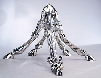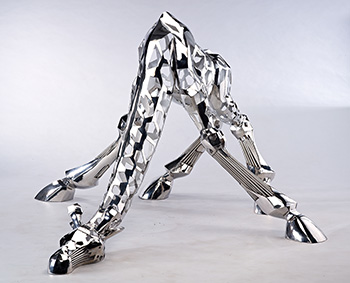 《長頸鹿—工業時代的保護色》以疲憊的長頸鹿為表現主體。作品運用不鏽鋼材料挑戰人們習以為常的視覺經驗。深邃的人文思維與新穎的實驗手法,不僅象徵工業文明與環境之間的衝突,更為觀者帶來視覺與心靈上的震撼。形體巨大的長頸鹿倦怠地俯身地上,周身鏡面一般的不鏽鋼反照出觀者的形象。觀眾在觀賞作品的同時也融入了作品其中。光鮮的外表與疲憊的身體是無數都市人的真實生活寫照,注視別人的同時,也在他人身上看到自己的身影。所謂工業時代的保護色其實也是彼此的內心寫照。