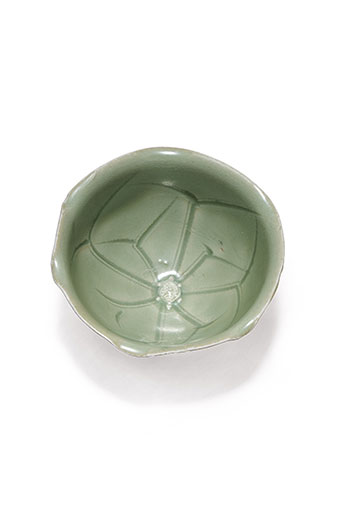 此盞通體施青釉,口沿為花式翻口,盞內刻畫樹葉紋,寥寥數刀刻畫樹葉的形狀與葉脈,刀法嫺熟簡練。釉色深沉,色澤優雅。底部小圈足,盞心內貼塑烏龜一只,小巧可愛。