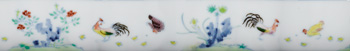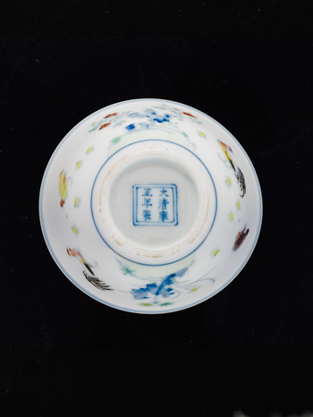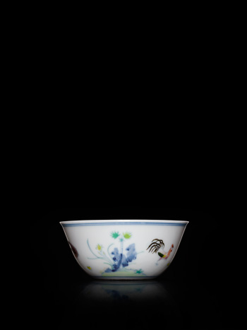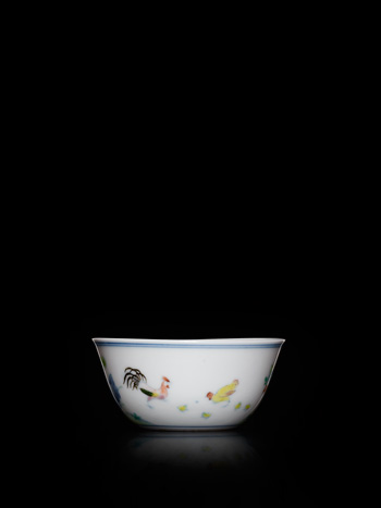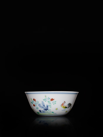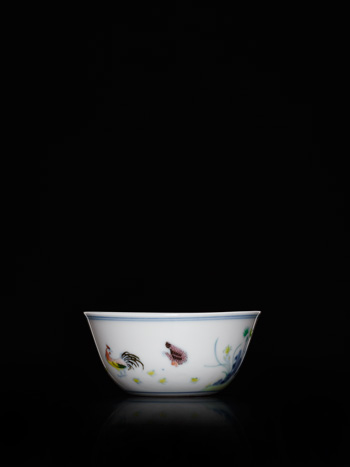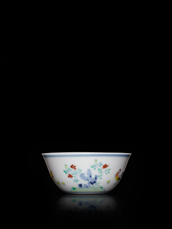 杯敞口,深腹,臥足。通體鬥彩裝飾,外壁繪兩組子母雞悠閒於草地覓食,兩組雞群隔以洞石月季與湖石蘭花,所繪圖樣清雅秀美,能臻下真跡一等的擬真境界,底書青花雙方框「大清雍正年製」雙行六字楷書款。此類鬥彩雞缸杯以明代成化朝所製作品最受世人追捧,清代以降歷朝皇帝多有仿製,其中又以雍正朝所模擬的雞缸杯最具藝術造詣水平。
