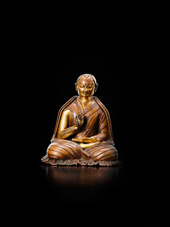 髡髮光顙,蹙眉斂眼,神情專注。身著通肩式袈裟,衣褶流轉自然,雙手當胸結說法印,足掌露於僧袍之外,全跏趺坐於巾毯上。是件高僧坐像,所澆銅質姣好,通體鎏金,局部斑剝,更顯時代遞嬗的自然風化痕跡,又造型簡練,形象寫實,頗能彰顯三世達賴索南嘉措(1543-1588)的弘法精神。