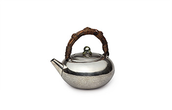 此壺器型渾圓飽滿,搭配藤把,玉摘及砲口的設計著實巧妙的合併了中國及日本的茶道文化精髓,並透過精巧地設計克服了許多茶人在使用銀壺泡茶上的困擾。