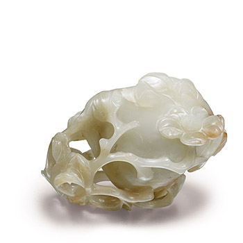 Made from a single piece of Nephrite with a glistening texture, the inner section has brown tress marks. The body of the cup is shaped like a sunflower and the middle has been hollowed out. On the bottom, flower bud is lightly engraved. The walls of the cup compose the shape of the petals which are layered in pairs. One side of the midsection wall uses an openwork technique to sculpt the leaves. Meanwhile, leaves surround the four sides of the cup. The highly raised leaves not only depict liveliness and nature, the leaves coming out of the bottom of the cup also form a flat bottom. On the other side, leaves intertwine and flow around one side so as to be used as a handle. This is a rich, sophisticated piece of jade treasure with a diverse design.