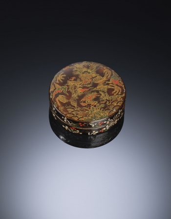 Of circular form, the cover intricately decorated with a four-clawed dragon protruding out of turbulent waves amidst auspicious stylised clouds, the sides with leafy greens and florets inlaid with the mother of pearl, all aganist a reddish dark brown ground extending to the interior and gilt with a reign mark on the base.