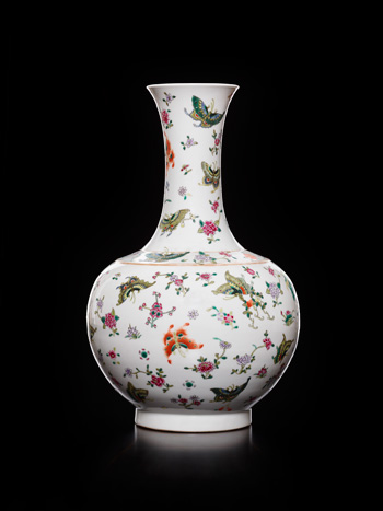 瓶口外撇,長束頸,溜肩,球腹,肩部凸起兩道寬帶紋,圈足。通體施透明白釉,肩部寬帶紋敷描金彩,頸、肩、腹繪折枝花卉彩蝶紋,所繪花卉彩蝶用色鮮麗明亮,洋溢一股生氣盎然的自然氣息。底書紅彩「大清光緒年製」雙行六字楷書款。