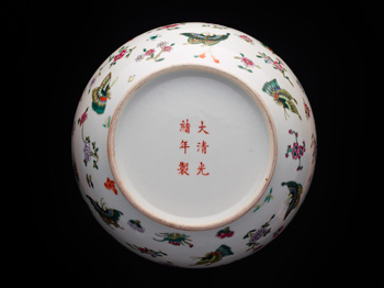 瓶唇口,短頸,豐肩,長圓腹,腹下漸收,至底部微外撇,圈足。腹壁一面以粉彩繪通景松蔭靈鶴圖,畫工細膩,用色艷麗,另一面上方留白處墨書:松鶴延年,丁丑春仲,擬南沙老人大意,為詒局長雅政,翥山程意亭畫。底書紅彩方框「佩古齋」三字篆書款。程意亭(1895-1948),珠山八友之一,字體孚,名甫,號翥山子、泊山山民,齋名佩古齋,江西樂平縣人,近代著名陶瓷畫家,所繪花鳥瓷畫,向瓶唇口,短頸,豐肩,長圓腹,腹下漸收,至底部微外撇,圈足。腹壁一面以粉彩繪通景松蔭靈鶴圖,畫工細膩,用色艷麗,另一面上方留白處墨書:松鶴延年,丁丑春仲,擬南沙老人大意,為詒局長雅政,翥山程意亭畫。底書紅彩方框「佩古齋」三字篆書款。