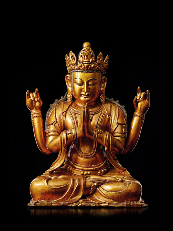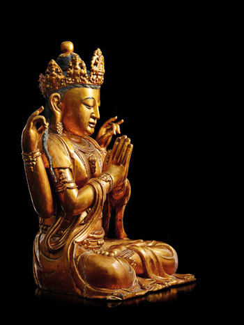 頭戴五葉寶冠,冠葉內嵌化佛,頂束葫蘆式高髻,上安牟尼寶珠,耳際繒帶垂落兩肩。雙目俯視,面容圓潤,法相莊嚴。上半身袒露,胸前垂掛瓔珞,雙肩搭帔帛,帔巾沿臂飄垂。胸前兩臂當胸結合掌印,後二臂屈肘高舉,右手捻珠,左手持蓮(已失)。腹部微凸,腰束長裙,裙衣貼體,露出跣足,全跏趺坐。