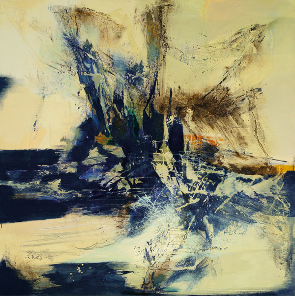 此件《浪淘沙》作於2007年。已經歷十數年,楊識宏的抽象的植物的美學已然成熟。畫面中仍以楊識宏一貫使用的大地色為主,採取如波浪與土地的色澤,但抽象手法使波濤和自然環境的形貌有所改變,藝術家使之模糊化,成功營造了天地海交會成一片時的激動。除了有畫筆的大片揮灑,也有細小點狀的細部經營,大器與細膩兼備。