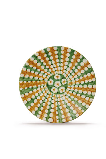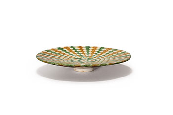三彩器物在唐代時期大量燒制,而進入宋代以後銳減。此拍品為唐宋過渡階段五代時期所燒制。釉面較薄,無明顯的流淌痕跡,盤中為三彩的最為代表的三種顏色綠黃白三色裝飾,錐形的黃色與綠色圖案指向盤心,黃綠之間點綴白色斑點,規則的分佈於盤身。盤心五朵花卉,白色花瓣,黃釉為花蕊,綠地襯托
